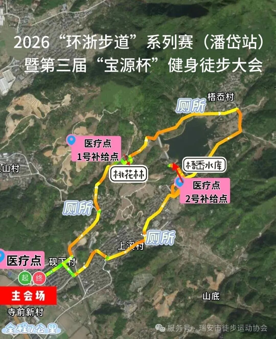 活动起终点:瑞安市潘岱街道仲容社区砚下村 活动时间:2026年4月4日周日上午07:30 活动路线:潘岱街道仲容社区砚下村→山梧环线→寺前村→桃花林→梧岙村→梧岙水库→集善社区新星村→上溪村→山南村→孙诒让主题公园。(详见赛事线路图) 线路介绍:全程约7公里,沿途设置2个补给点(打卡点)3处医疗观察点以及明显路标和引导工作人员。 报名费:免费(含:圆领速干T恤衫、纪念品、矿泉水、烤面包、水果、保险费、抽奖礼品、赛事包) 活动方式: 1、按指定路线行进,(沿途会有路标与引导人员),逐一打卡(桃花林、梧岙水库点),活动路线中未打卡、漏打卡者不能参加抽奖及领取相关奖品。本次活动关门时间为120分钟。